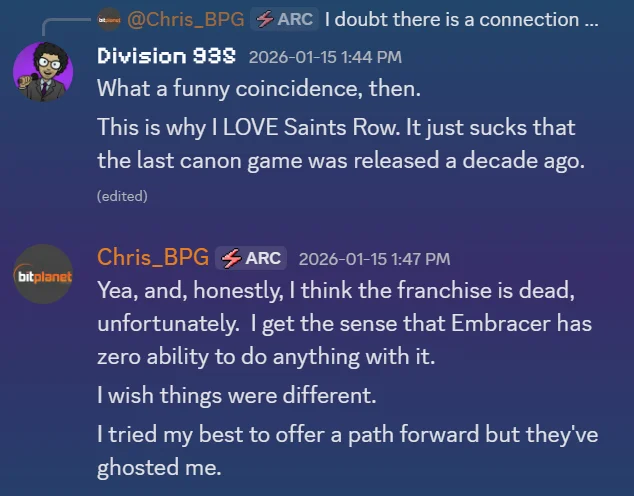 Один из ключевых авторов оригинальной Saints Row (2006), Крис Стокман, недавно заявил, что считает франшизу фактически «мертвой». Он рассказал, что пытался предложить владельцам прав свежую концепцию и вернуть серию «к корням», но его игнорировали.
