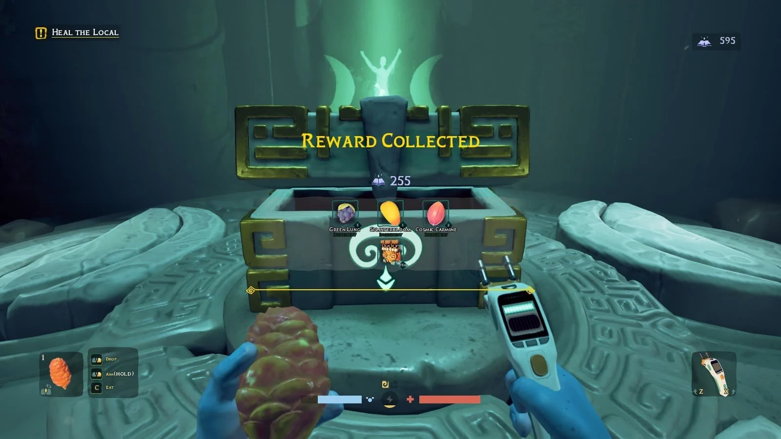 После успешного заполнения всех трёх фруктов появится сундук с наградой — верхняя часть тотема.
